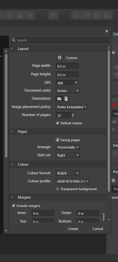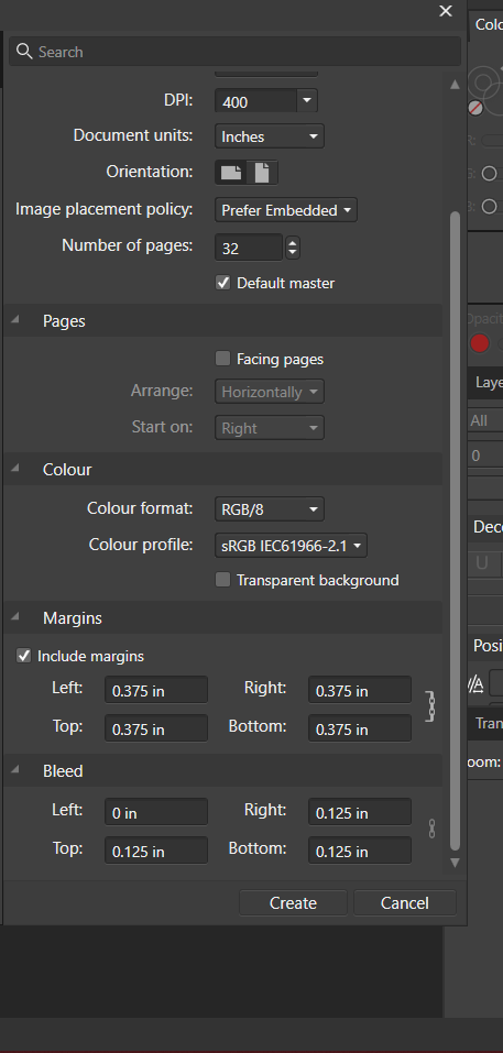The white area is the pages safe space and the dark area surrounding it is the bleed (notice how there is no extra space on the left). Anything found within that area will be cut; Affinity does have a preview mode that will show you exactly what will be removed once printed.